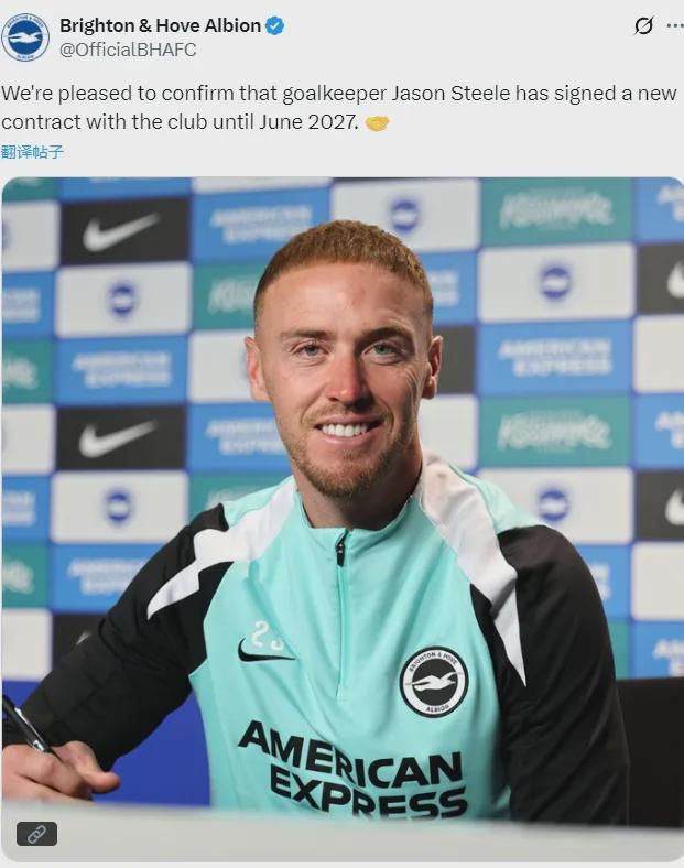 官方:布莱顿宣布门将贾森-斯蒂尔签下了一份2027年到期的新合同。